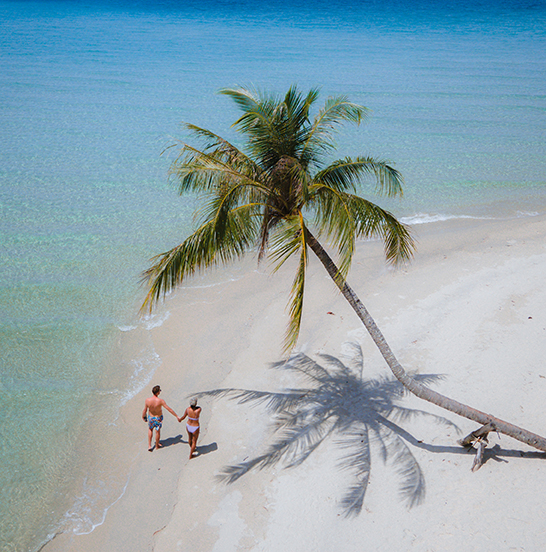 Tropical beach with palm trees at the Island of Koh Kood Thailand. white tropical beach with blue ocean couple men and women on vacation in Thailand Aerial drone view from above